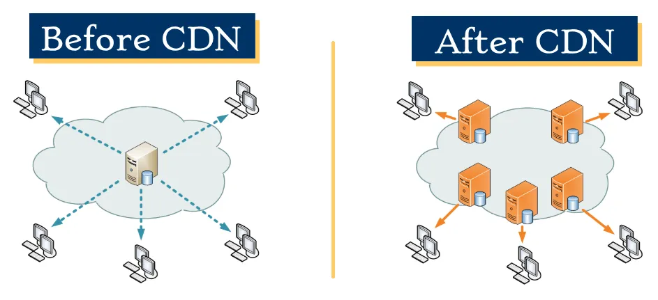 Eksemplet under “Before CDN” viser en tradisjonell løsning hvor server(e) er sentralt plassert som skalerer mindre for høy etterspørsel. Denne løsningen er mer sårbar dersom flere andre henter data fra denne kilden samtidig, så vil trafikk-hastigheten deles. Eksemplet “After CDN” viser en mer distribuert løsning av servere som er utplassert nærmere brukerne. En slik løsningen benyttes av de fleste innholdsaktører som møter høy etterspørsel og bruk av tjenester.