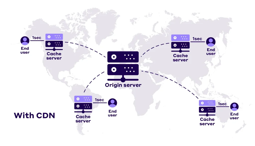 • Cache er en lagringsplass for statisk innhold som er distribuert på CDN-servere over hele verden. Når innholdet ikke er i cachen, vil CDN-en hente det fra origin-serveren og mellomlagre det i cachen for fremtidige forespørsler (i en hvis tidsperiode). Dette forbedrer ytelsen betydelig, da brukere ikke trenger å vente på at innholdet skal lastes ned fra origin-serveren som kan være langt borte.